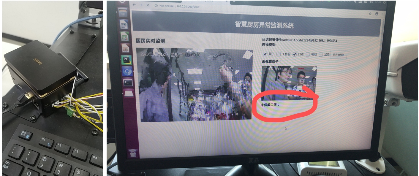 Use the detection algorithm to detect irregular behaviors in the kitchen in real time, such as smoking, not wearing a mask, not wearing a hat, rats, etc. The algorithm is installed on the TX2 device.